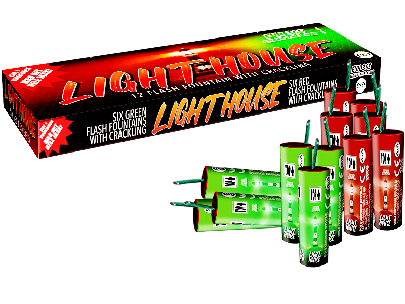 Lighthouse n6 rode en 6 groene flash fonteinen met crackling. n nKruitgewicht 54 Gram nTube diameter – nBrandtijd – Seconden nHoogte –